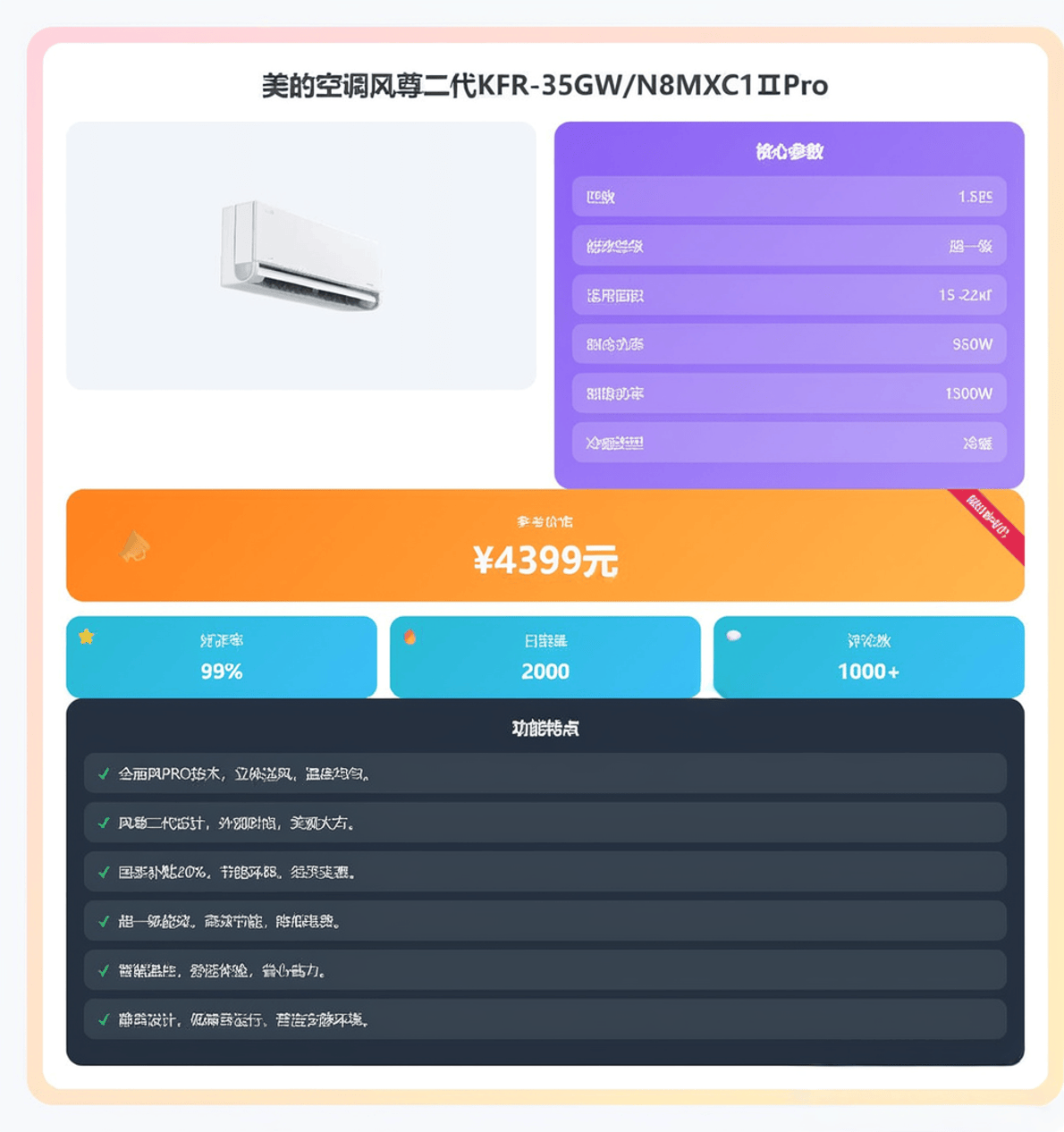 这款N8XA1P的价格非常有竞争力,在两千五区间。它的定位很明确,就是在保证核心性能(新一级能效)的基础上,提供一个极具吸引力的入门价格。虽然在一些非核心的配置上做了精简,比如导风板的材质、智能功能的丰富度,但基础的变频冷暖、快速降温、自清洁、APP控制这些都有。