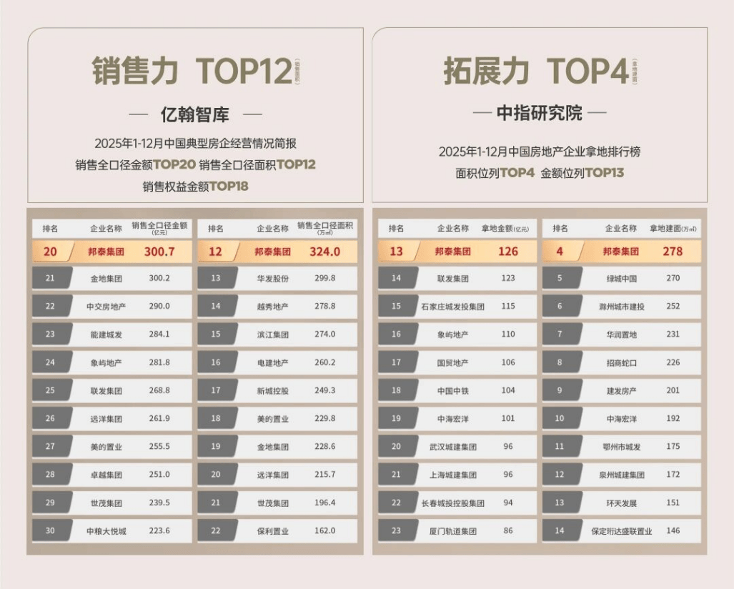 2026-03-25必威官方网站,Betway必威,必威APP下载从最新发布的2025年1-12月典型企业销售情况来看,邦泰2025年销售额首破300亿,以300.7亿全口径销售金额位列第20名,以324万mi全口径销售面积位列第12名(数据来源:亿翰智库)。操盘金额与面积双双稳居全国TOP20阵营。(数据来源:“中国房企稳健经营十强由亿翰智库于2023年授予邦泰)