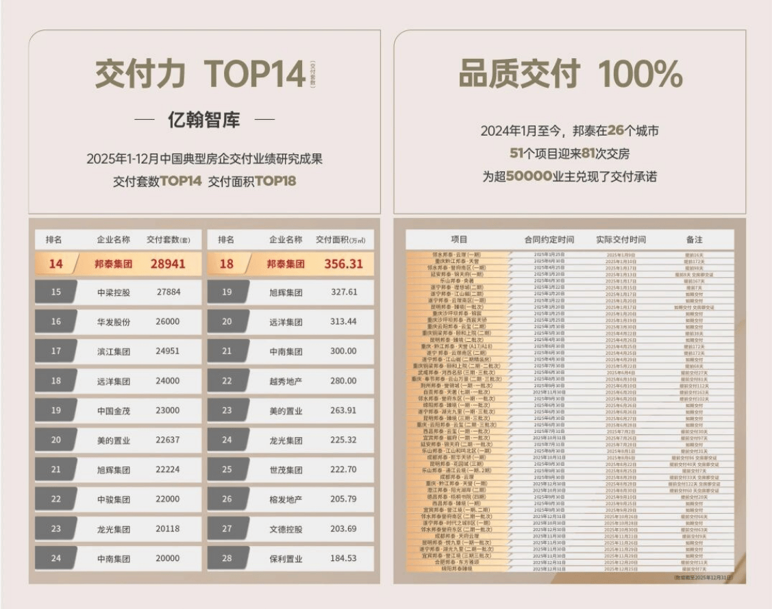 信誉,始于承诺,终于交付。2024年1月至今,邦泰已在26个城市,51个项目,共计交81次,近70%的项目实现提前交付,交付超50000户。交付实力,也让邦泰荣膺中国房地产界最高荣誉奖项之一的中国地产华表奖“2025年度中国好房子品质交付企业”。