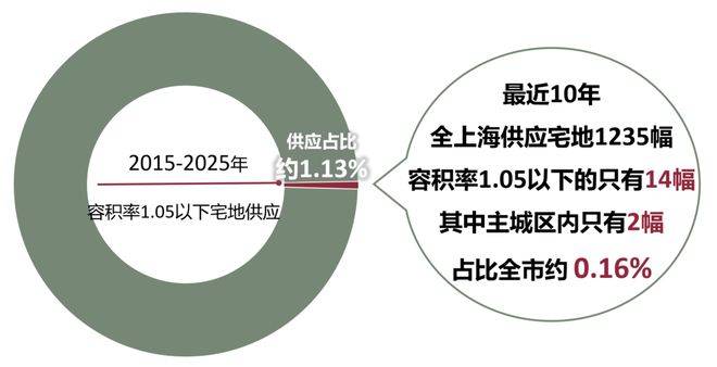 而据克而瑞数据统计,过去的这十年,全上海累计供应1235幅宅地,其中容积率≤1.05的一共只有14块,占比仅约1.13%。