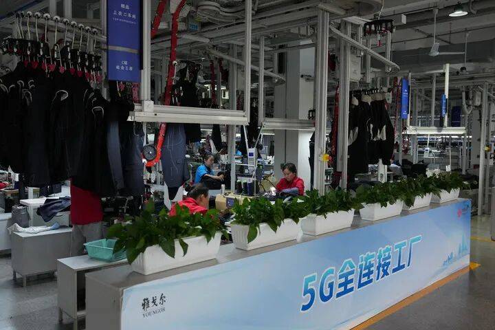 雅戈尔的5G智能工厂,为服装生产带来一场变革:一套自动吊挂系统覆盖在车间顶部,悬挂在系统上的半成品布料顺着传送带在各个工位间运转。操作工人从系统上取下布料进行加工,完成后再挂回系统,传送带又带着布料前往下一个工位。