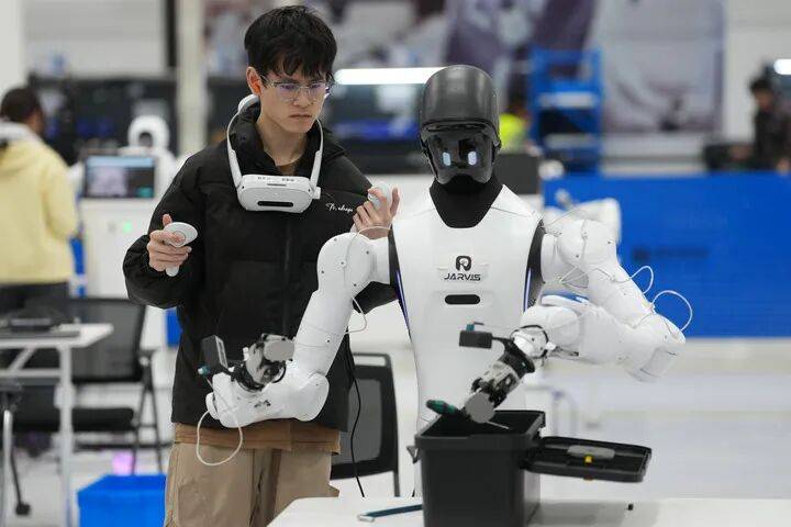 在宁波普智未来机器人有限公司,技术人员调试人形机器人在工业场景下的应用。