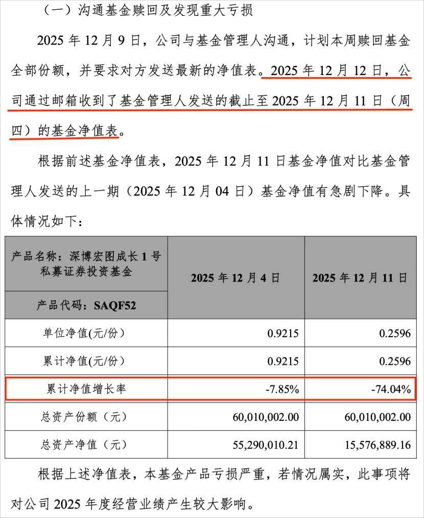 12月9日,圣元环保方面与深博信投沟通,计划赎回基金的全部份额,并要求对方发送最新净值表。结果拿到以后,一看傻眼了:净值比一周前急剧下降了74.04%。