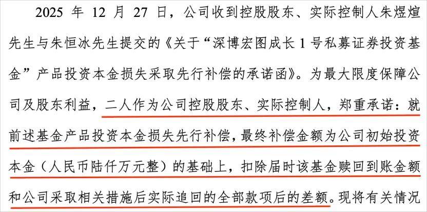 同日,圣元环保控股股东、实控人朱煜煊与朱恒冰提交了一份承诺函,承诺就前述基金产品投资本金损失先行补偿,补偿金额为6000万元投资本金的基础上,扣除基金赎回到账金额和公司采取相关措施后实际追回的全部款项后的差额。