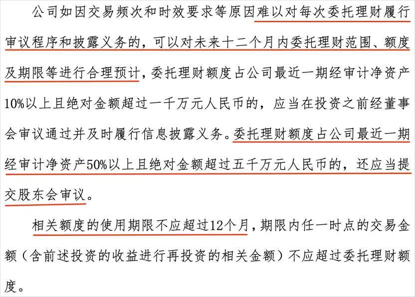 根据该公司披露的对外投资管理制度,当理财额度占公司上期审计净资产50%以下或金额低于5000万元时,无须经过股东会,由董事会审议通过并披露即可,且并不需要对每笔委托理财单独披露。