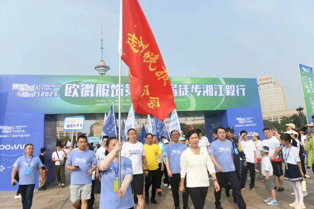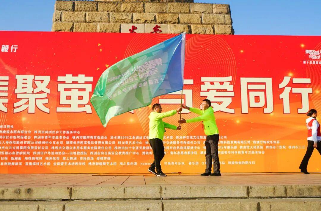 ▲2025年第十五届徒步湘江毅行启动仪式上,株洲日报社党组书记、社长、总编辑谌孙爱为毅行志愿者授旗。
