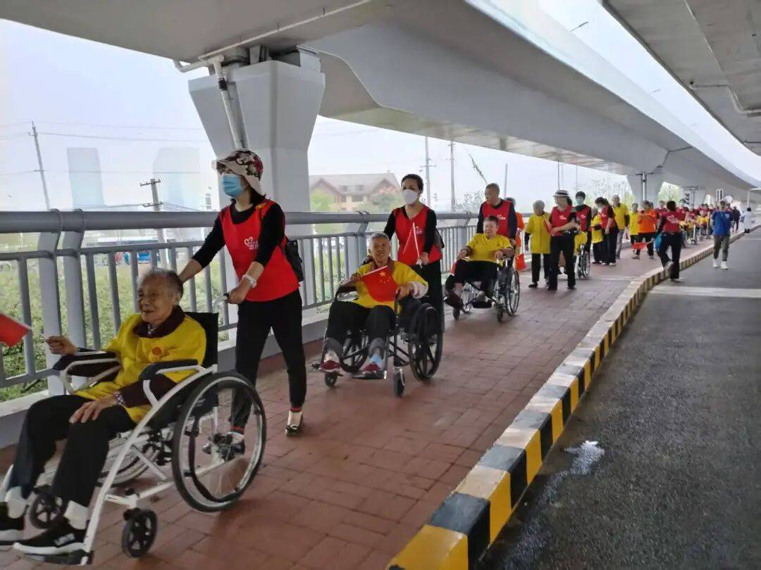 ▲2023年9月27日,来自石峰区清水塘养老院、芦淞区德合如家颐养中心的老人,在志愿者一对一陪伴下游览清水塘大桥。