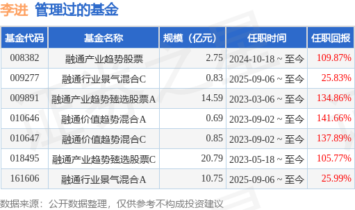 李进先生:中国国籍,清华大学工学博士,2017年7月加入融通基金管理有限公司,担任行业研究员。2023年3月6日任融通产业趋势臻选股票型证券投资基金基金经理。2023年9月2日担任融通价值趋势混合型证券投资基金基金经理。2024年10月18日担任融通产业趋势股票型证券投资基金基金经理。2025年9月6日起任融通行业景气证券投资基金的基金经理。