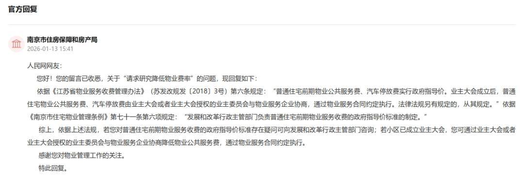 南京官方给出了明确回应:普通住宅前期物业费实行政府指导价;业主大会成立后,可由业委会与物业协商定价。
