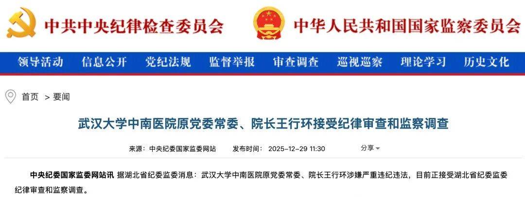 此前,2025年12月29日,据中央纪委国家监委网站援引湖北省纪委监委消息通报:武汉大学中南医院原党委常委、院长王行环涉嫌严重违纪违法,目前正接受湖北省纪委监委纪律审查和监察调查。