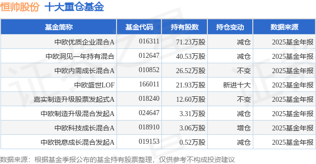 根据2025基金年报公募基金重仓股数据,重仓该股的公募基金共8家,其中持有数量最多的公募基金为中欧基金的中欧优质企业混合A。中欧优质企业混合A目前规模为17.21亿元,最新净值1.361(3月9日),较上一交易日下跌1.56%,近一年上涨38.71%。该公募基金现任基金经理为代云锋。代云锋在任的基金产品包括:中欧洞见一年持有混合,管理时间为2022年7月7日至今,期间收益率为30.44%;中欧科技成长混合A,管理时间为2024年2月2日至今,期间收益率为109.45%。