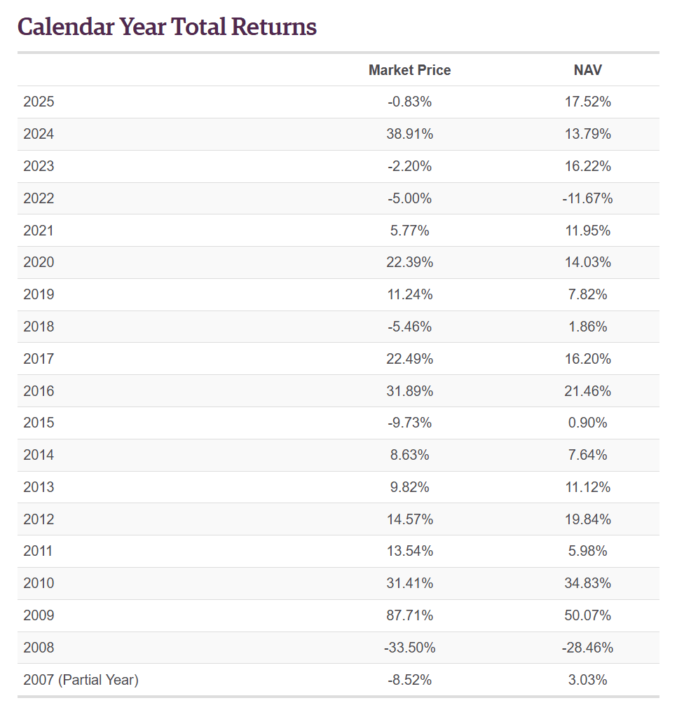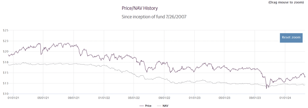 GOF过去一年的真实表现其实不太好看。它的NAV(净资产价值)是涨的,但股价却在跌。