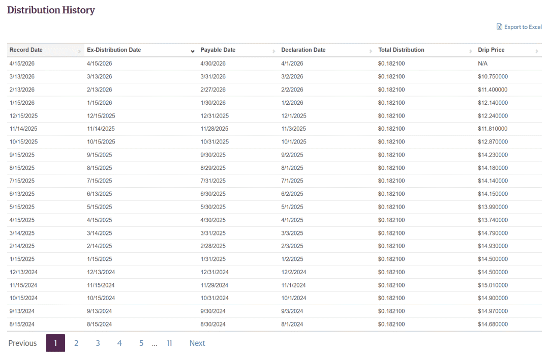 因为从2013年5月开始,GOF每个月的派息就固定在0.1821美元一股。13年,无论股价怎么波动,市场怎么震荡,这个数字没变过。