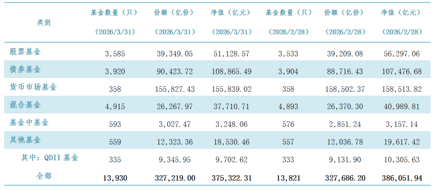 尽管总规模出现回落,但产品供给端的扩容步伐并未停歇。截至3月末,全市场基金总数已达13930只,单月净增109只,表明基金管理人布局产品的积极性依旧不减。